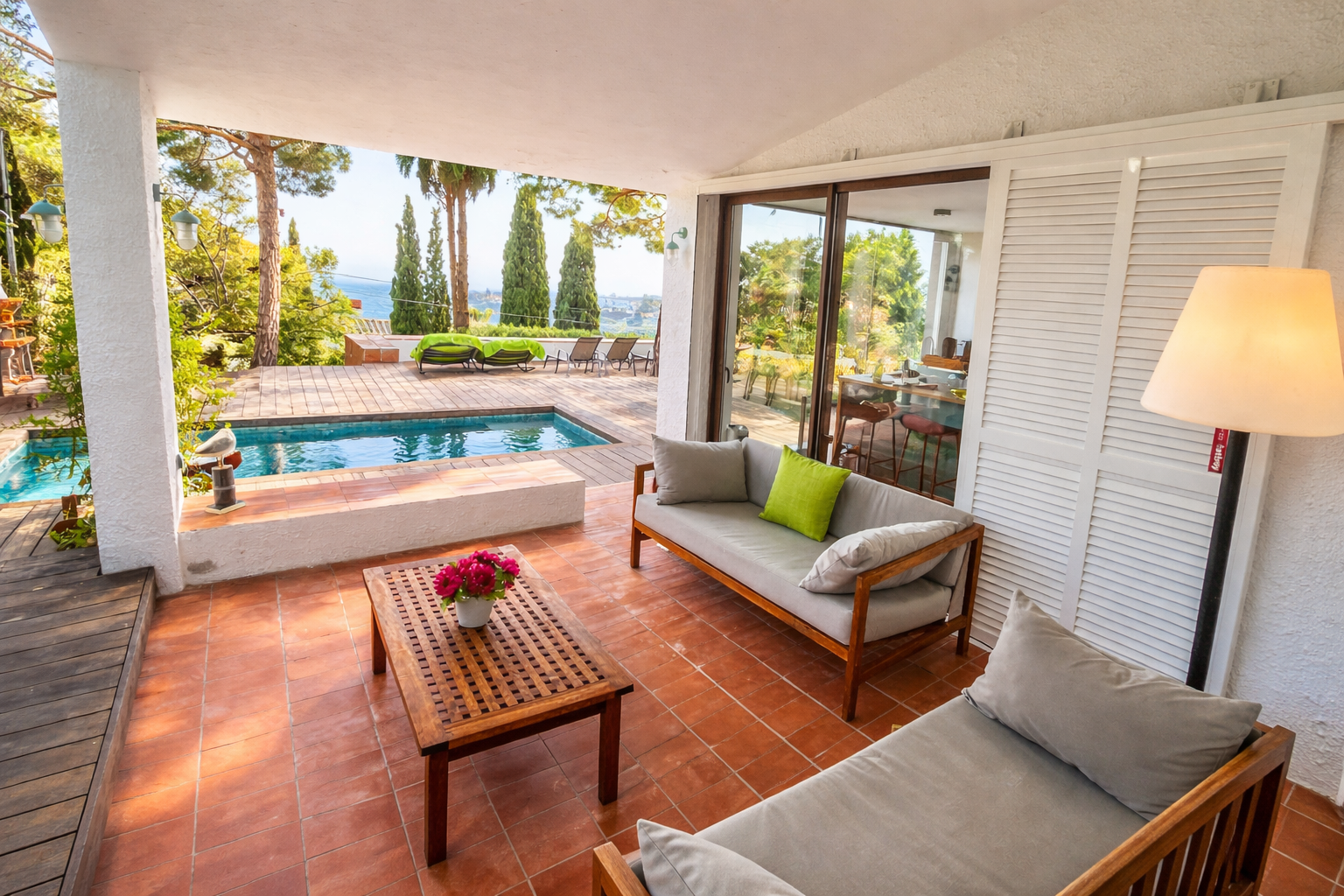 Alle Schlafzimmer sind klimatisiert und sorgen so ganzjährig für eine angenehme Temperatur. Draußen erwarten Sie eine Terrasse mit Essbereich, eine Veranda mit bequemen Sofas und ein Grillplatz – ideal für entspannte Abende. Eine Außendusche mit Warmwasser lädt nach einem Tag am Strand oder Pool zum Abkühlen ein.